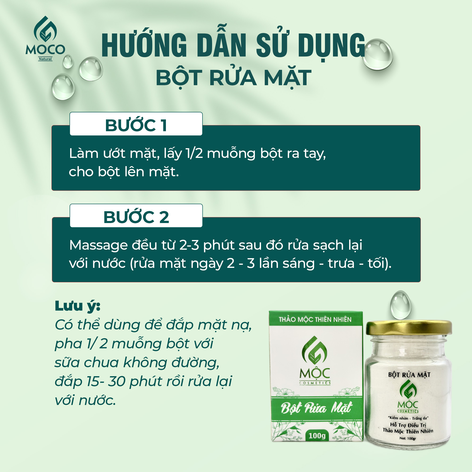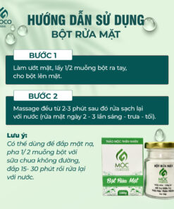 – Làm ướt mặt, lấy 1/2 muỗng bột ra tay, cho lên mặt massge đều từ 2-3 phút sau đó rửa sạch lại với nước (rửa mặt ngày 2-3 lần sáng – trưa – tối).